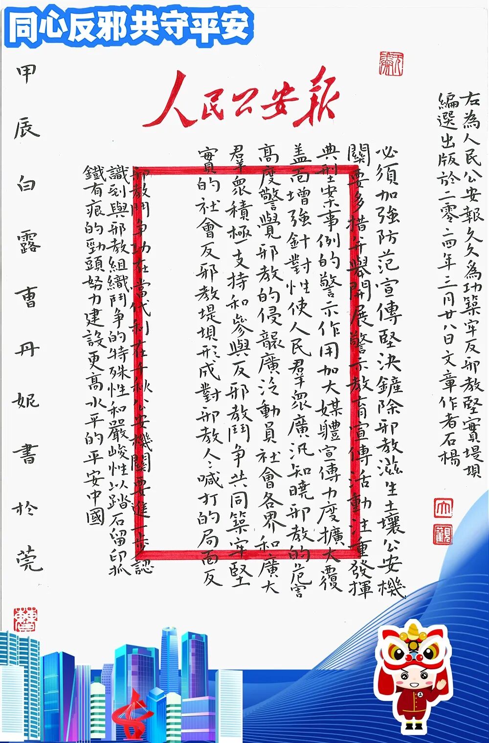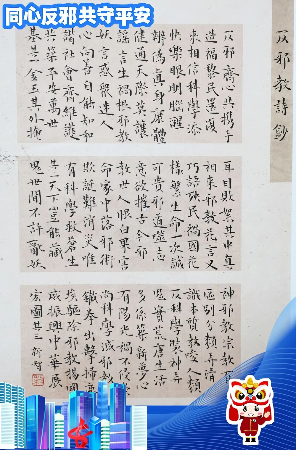 为扩大反邪教主题的优秀文艺作品的影响作用,现将一、二、三等奖的优秀作品进行网络展播,以书反邪,共创平安。