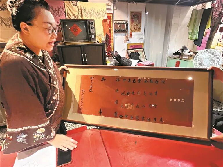 “随手拿起都是古物”,八姑姐戴上白手套,从老木箱中掏出一件件老物件。只见她举起一份用玻璃框装裱的礼书介绍,“这是光绪年间的,落款写着‘回允之礼’,即新娘嫁妆。‘龙涎凤炬’即是龙凤烛,‘福寿团圆’即是百福被……”这份礼书,不仅记载着百年前的婚庆礼品,而且词藻华丽、极具文学性。