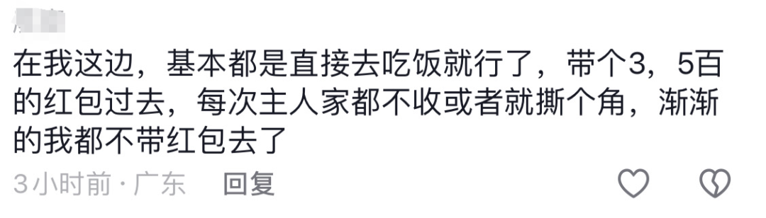 客人参加广府婚宴,一般随一两百元的份子钱,有主人家还会回礼,或把红包折个角又返还给宾客,代表心意已领。这种婚俗曾引发网友的好评,反映岭南人务实、包容的一面,既注重仪式感,又有开放意识,推动广东省婚俗改革走在全国前列,让婚姻始于爱、让彩礼回归于礼。