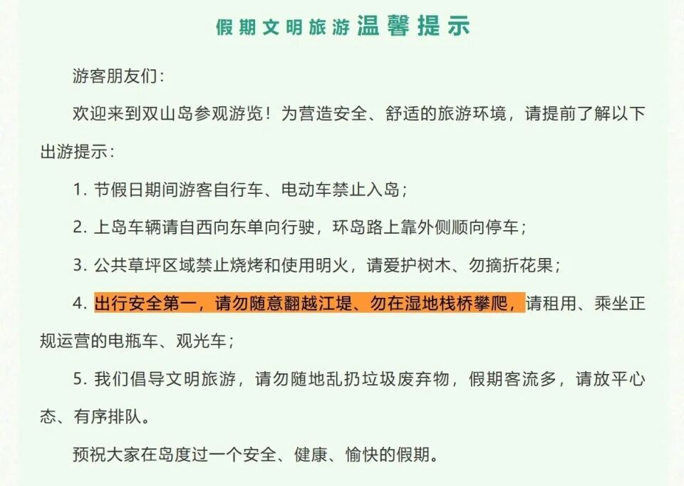今年6月8日,双山香山旅游度假区发布端午节游览提示,“出行安全第一,请勿随意翻越江堤、勿在湿地栈桥攀爬”。