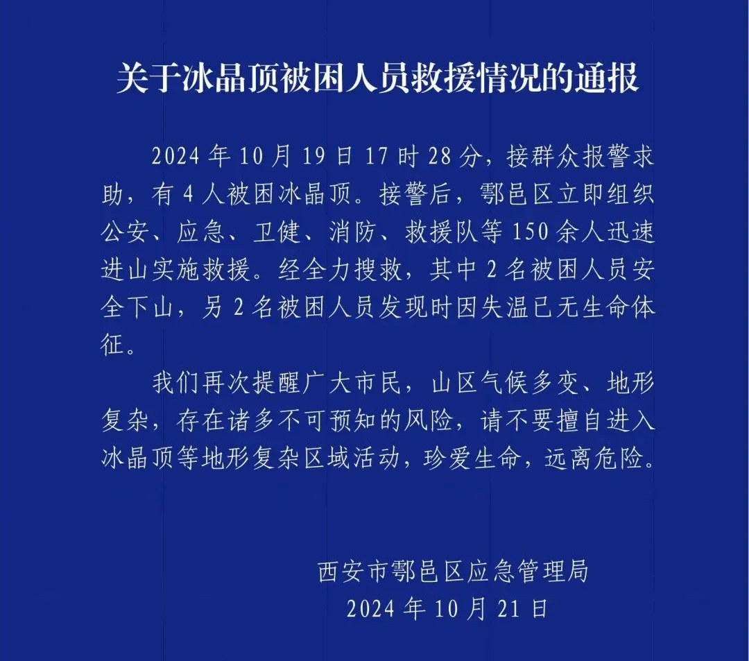 10月21日上午,一位遇难者亲属表示遇难两人是情侣,都是二十多岁。一位救援人员表示:“他们从野路上的冰晶顶,有带基本装备,只是没想到突然变天。”