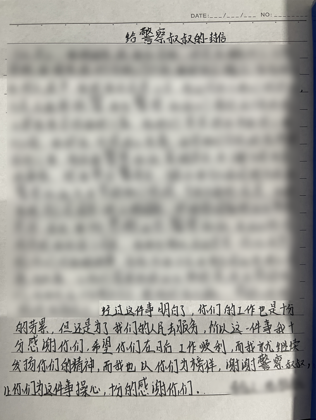 民警语重心长地对小天进行了教育,告诉他不能因为赌气就离家。看到孩子安然无恙,小天父母连连向民警道谢。民警也叮嘱家长,教育孩子一定要注意方式方法。当日下午,小天带着一封感谢信来到羊额警务室,感谢警察叔叔的帮忙。