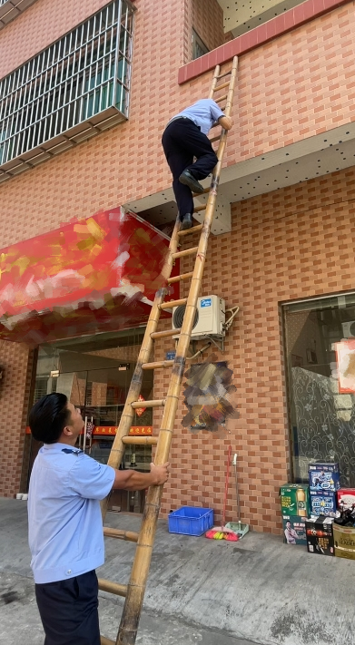 5米高的竹梯,每爬一步都会摇晃,看得周围的群众也紧张起来,一位老奶奶不住提醒 “哎呀!慢一点,慢一点”。