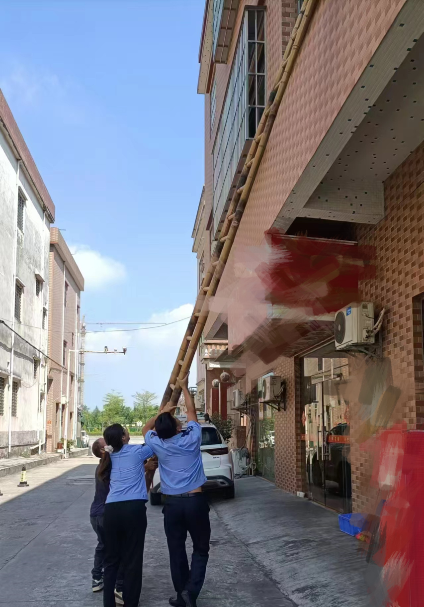 很快,热心邻居借来了一把5米长的竹梯。三人分工合作,一人爬梯,两人手脚并用在下面顶住梯子防止滑动,此时,热心邻居也加入进来。