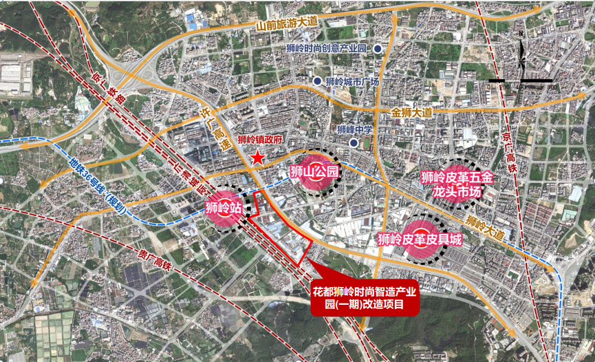 花都狮岭时尚智造产业园(一期)改造项目位于花都区狮岭镇,改造范围30.69公顷(460亩),现状以集体厂房为主;紧邻广清城际狮岭站,对外交通便利,周边居住、商业、产业配套完善。