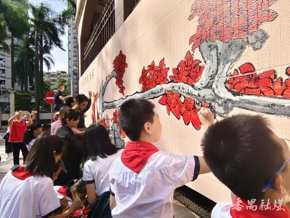 当天,来自番禺新华书店、番禺图书馆、德兴小学、番禺区阳阳实验幼儿园等单位的代表,以及党员志愿者、市桥街红棉老兵志愿服务队、学生代表等50人齐聚一堂,共同见证了这一文化活动的启动。在专业画师的指导下,参与者们纷纷拿起画笔,以墙为纸,以花为媒,用心勾勒每一笔线条,仔细填充每一块色彩。他们笔下绽放的英雄花,不仅色彩鲜艳、形象生动,更寓意着革命先烈的英勇事迹和崇高精神。整幅墙绘作品在蓝天白云的映衬下,更显庄重而富有历史感,成为了社区文化的一道亮丽风景线。值得一提的是,本次活动还特邀了广州市青年书法家协会理事、番禺区硬笔书法家协会副主席、广州市番禺新华书店有限公司总经理李万里先生为墙绘题字“英雄花开英雄城”。李万里的题字苍劲有力,与墙绘作品相得益彰,为整幅作品增添了浓厚的文化氛围和艺术价值。