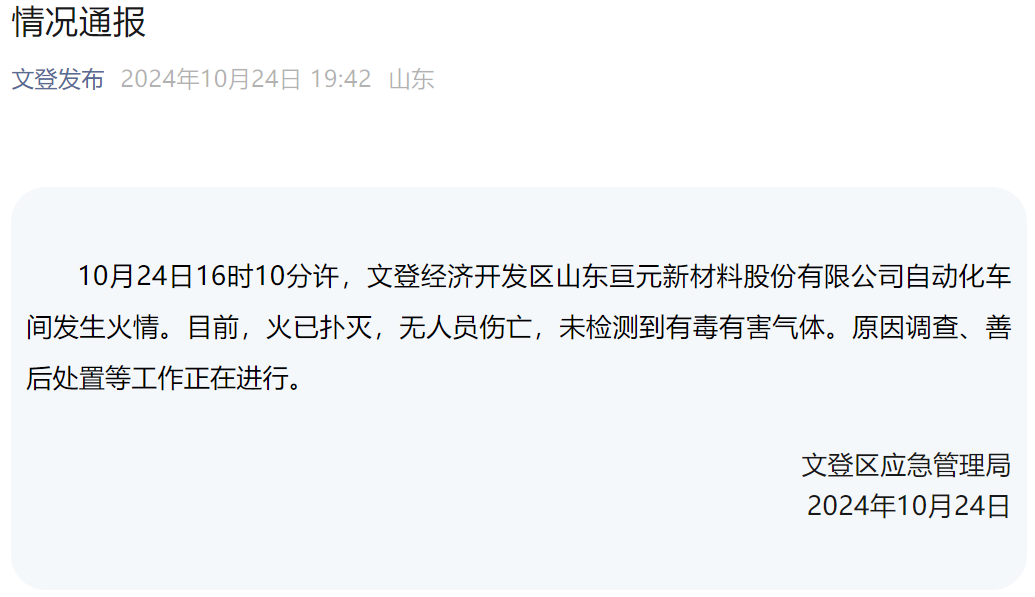 24日晚,威海文登区应急管理局发布通报:10月24日16时10分许,文登经济开发区山东亘元新材料股份有限公司自动化车间发生火情。目前,火已扑灭,无人员伤亡,未检测到有毒有害气体。原因调查、善后处置等工作正在进行。