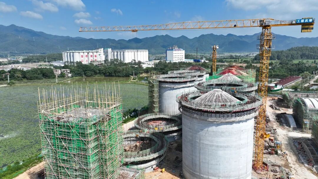 走进肇庆国家粮食储备库项目施工现场,只见几座巨大的圆柱形仓库拔地而起,塔吊、起重机等机械设备紧张运转;工人们忙碌地穿梭在各个施工区域,有序地进行着模板安装、钢筋绑扎、混凝土浇筑等作业……机器的轰鸣声、工具的敲击声交织成一曲激昂的奋进之歌。