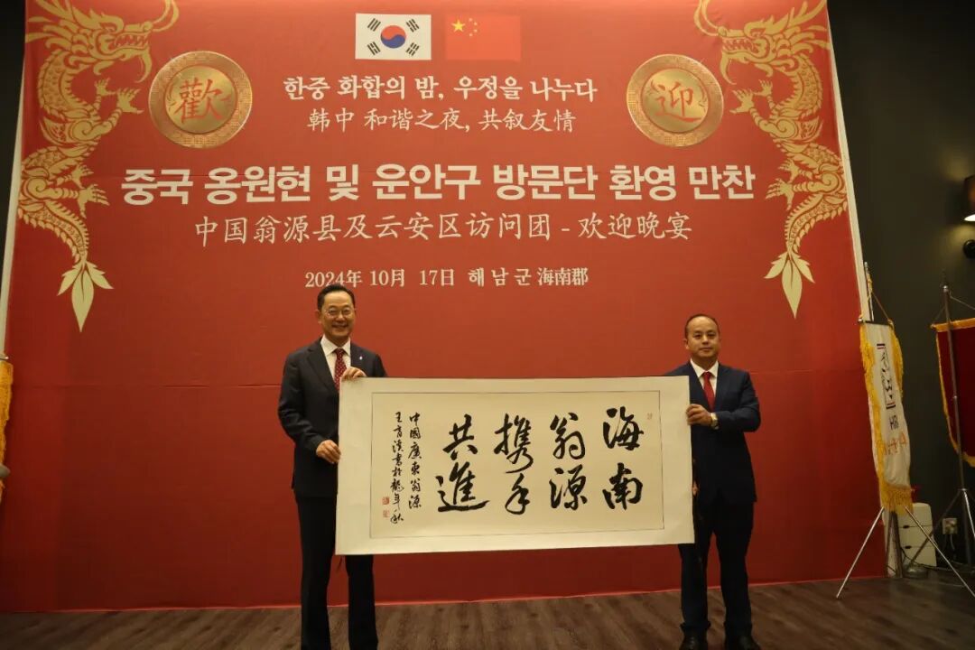 翁源县委常委、宣传部部长何茂文向海南郡政府郡守明炫官赠送书法作品