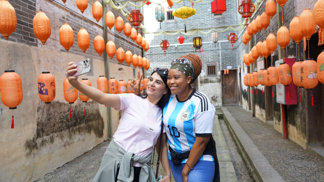 课上的所学所悟很快就“派上了用场”。当天下午,国际留学生们便来到了“中国围楼文化之乡”——韶关市始兴县,参观满堂客家大围。满堂客家大围至今保存完整,是广东省最大的砖瓦结构围楼,也是民居建筑中“方围”的杰出代表,有“岭南第一围”之誉,是全国重点文物保护单位。当前,满堂客家大围也成为了创新围楼保护和活化方式的标杆案例,当地大力发展“围楼+旅游”“围楼+综合服务”“围楼+创意产业”,让古围楼在新时代焕发出新的光彩。穿梭于围楼之中,行走于青砖井台之间,让人仿若穿越时空,与中国民间文化进行了更深层次的链接。“我的祖国也有很多城堡式建筑,但当我亲眼看到客家围楼的时候,仍然被它的建造方式所震惊。”来自俄罗斯的Danila告诉记者,客家围楼既保留了古韵,又在历史长河中不断融合了近代审美的雅致,让他感到惊叹。
