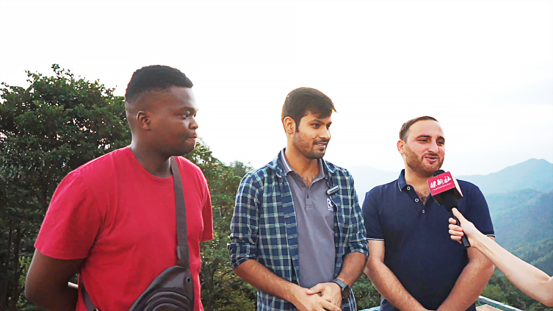 Ihsan(巴基斯坦,右)、Zahid(巴基斯坦,中)和Teddy(津巴布韦,左)向记者分享来到青云山的感受