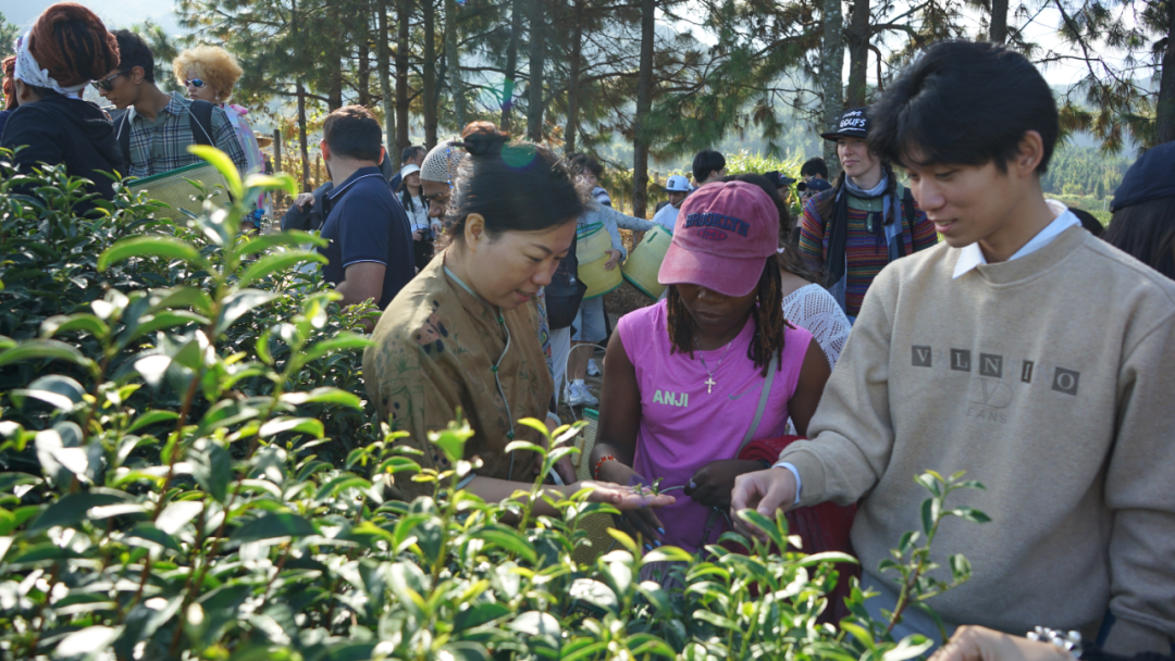 离青云山不远处,在黄磜镇茶峒村前面的半山坡上,有一片茶叶种植面积达350亩的有机茶园。这里处于710-1000米海拔之间,四面群山连绵、植被丰茂,虽高远而不干旱。茶叶生长于斯,汲取山水云露之精华,味道自是清净甘醇。在行程的第二日,国际留学生们就着晨曦、提着箩筐,早早来到了高山茶田,在茶园主的带领下,学习中国茶的历史,品尝韶关当地名茶,亲身体验采茶、制茶、茶礼,了解乡村茶产业从种植、加工生产到销售的发展现状。