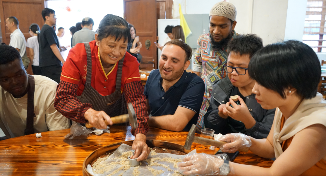 湖心坝民居群也是粤北地区极具代表性的客家建筑之一。位于仁川河畔,坐西南向东北,湖心坝民居群保存着59座明清时期建造的客家围楼,被誉为“粤北客家第一村”。来自苏丹的Sara细细走遍了围楼的每个角落,“这里有卧室、厨房、厅堂、小型学堂,甚至还有留给家畜的房间,感觉整个村庄都像一个家庭一样生活,村民邻里的关系非常亲密,令我非常着迷。”在充满生活气息的湖心坝里,国际留学生们还品尝了由村民精心制作的地道小吃“油罩糍”,体验了非物质文化遗产项目——客家米饼制作技艺,用味蕾体验客家文化的魅力。“米饼很特别很好吃,还特别容易制作。”Sara对记者说,“我对中国文化很感兴趣,无论是中国的服饰、建筑,还是食物,都有其独特的内涵并丰富了人们生活的方方面面。”