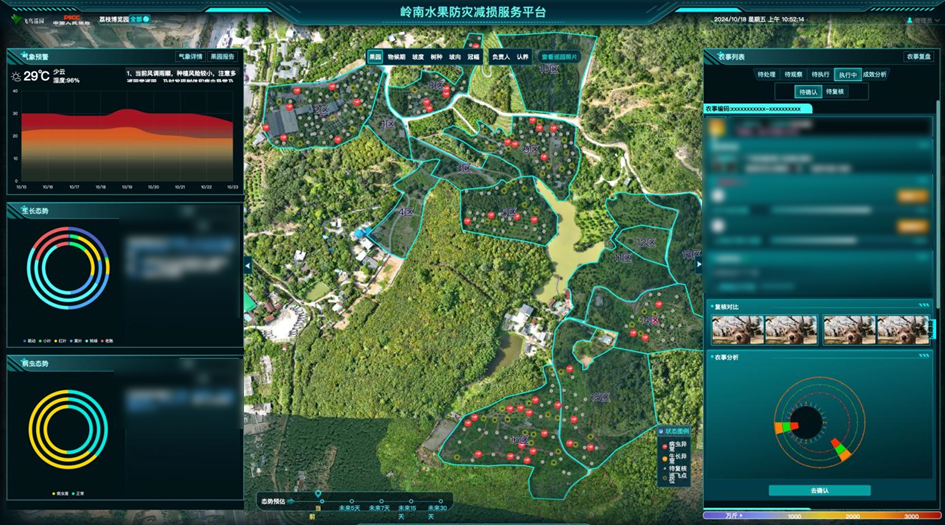 减损成效得益于“粤果保”平台的科技赋能,该平台集成“无人机远程巡园、智慧物联、AI算法、风险预警、专家诊断、信息推送、农事执行、效果评估”等八大要素功能,实现水果种植过程全链路闭环管理,以数字化管理推进产业标准化生产。其中,无人机的飞巡效率可达2000亩/天,相比人工巡园提升了500%。