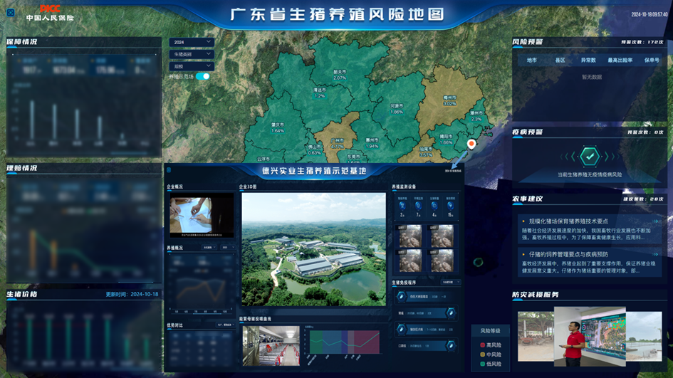 广东生猪养殖规模化率已达83.1%,位居全国前列。中国人保搭建“粤豚保”平台,为超3000家猪场、超2000万头生猪提供风险保障及养殖风控预警。当前已建立形成省级生猪防灾示范场,生猪出险率较往年降低30%。