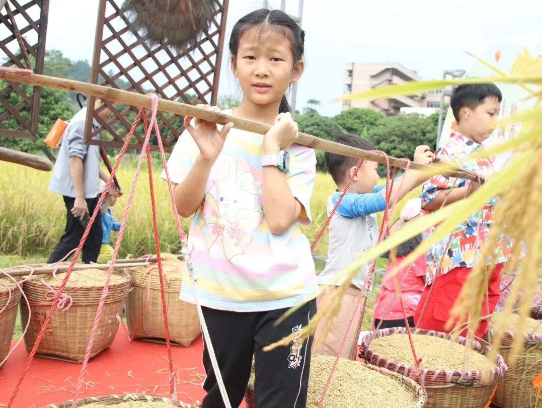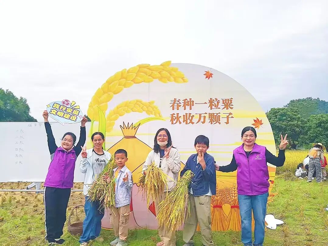 田间地头,金黄色的稻穗在微风中轻轻摇曳,宛如一幅天然的油画。亲子家庭分组进入稻田,开始了紧张而有趣的收割体验。在工作人员和巾帼志愿者的指导下,孩子们小心翼翼地拿起镰刀,割下一束束饱满而沉甸的水稻,家长们则在一旁协助,共同体验着丰收的快乐。
