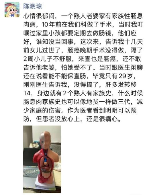 朋友圈中的提到的小儿子,即29岁的小秦(化姓),他近日到我院结直肠外科一区周家铭副主任医师处就诊。小秦自述1月前大便不成形,每天排解大便1-2次,此前也有类似的情况。这在消化道疾病中是相对轻微的症状。周家铭继续询问家族史,听到一句话,他面色凝重。