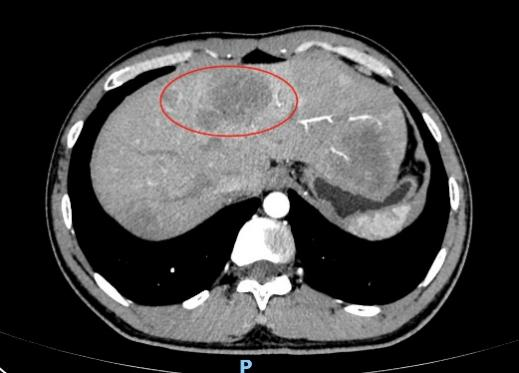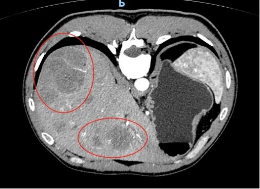 (CT下显示肝脏转移)