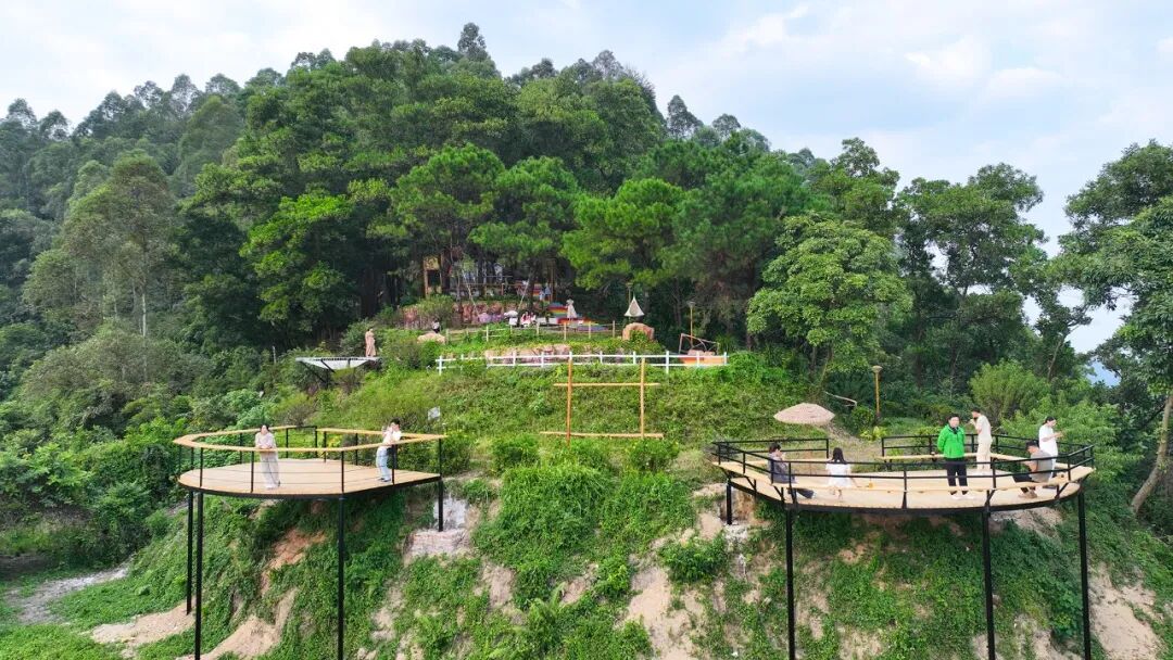 穿过丛林咖啡木屋,沿着彩虹步梯往外走,就是丛林咖啡观景平台。平台使用外延式搭建,在山腰往外探出,视野开阔,高要别致的田园风光尽收眼底。