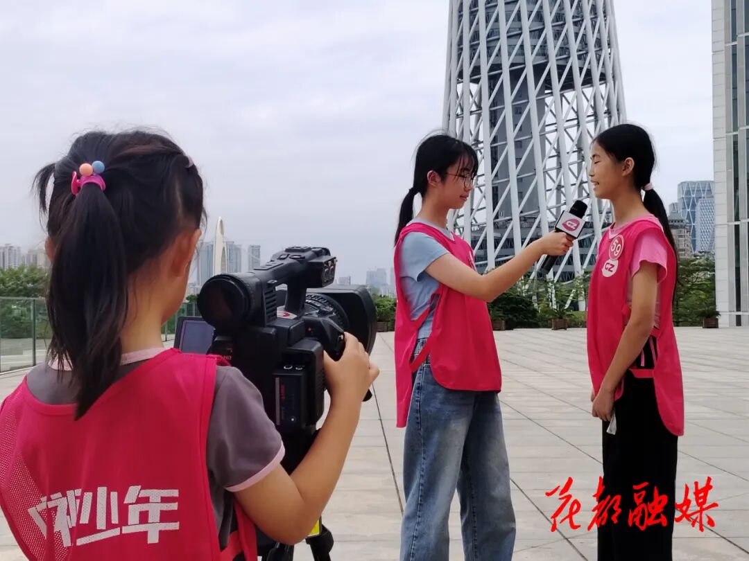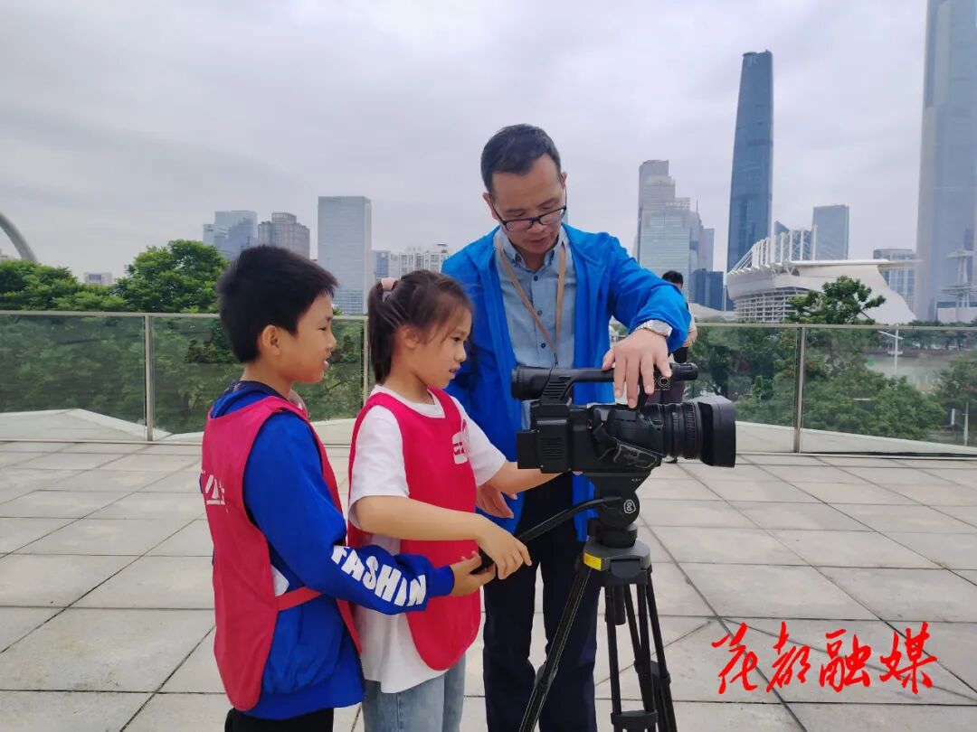 请问你看到广州塔有什么感受?这位同学,今天参加研学有什么收获?同学们在老师的指导下,分组开展采访、拍摄体验活动。