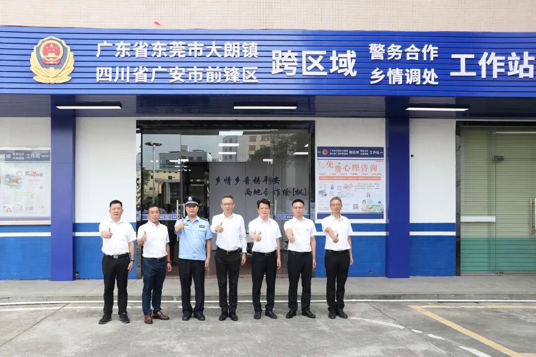 10月18日上午,大朗镇举行“东莞大朗-广安前锋跨区域警务合作(乡情调处)工作站”揭牌仪式,大朗镇党委书记郭怀晋,镇党委委员蔡培光,副镇长、公安分局局长梁国沛,中共广安市前锋区驻大朗镇流动党委书记刘军以及镇有关部门负责人共同为跨区域警务合作(乡情调处)工作站进行揭牌。