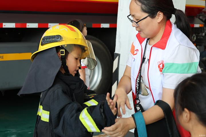 同学们亲身体验消防队员装备