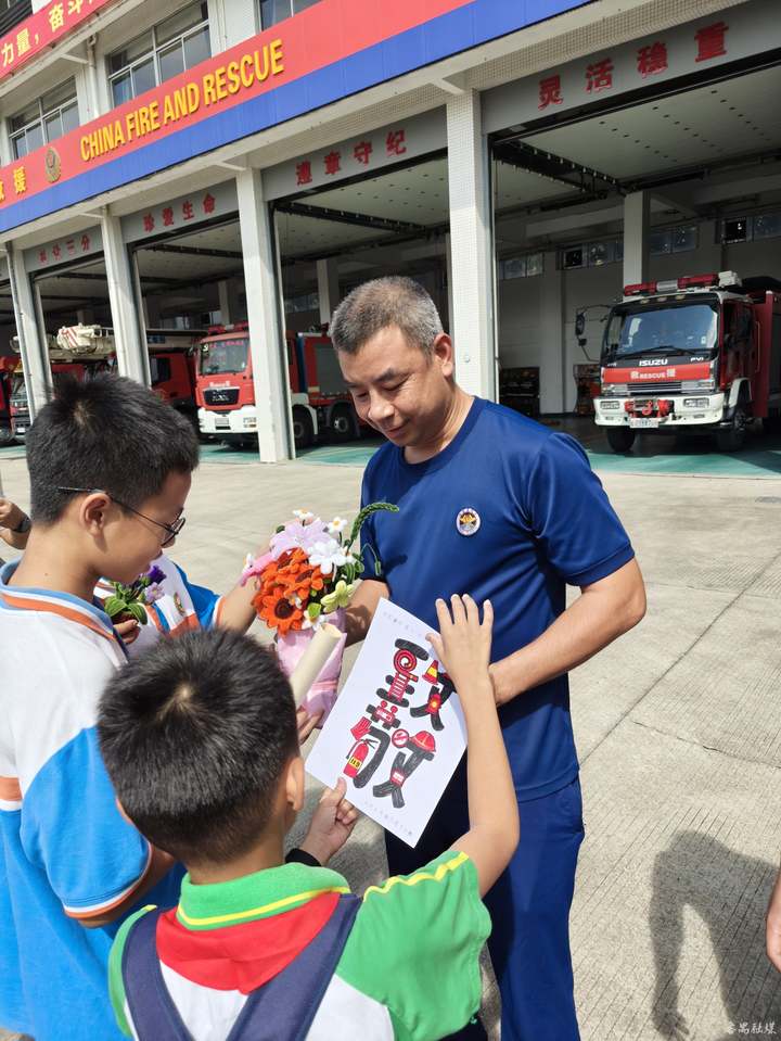 消防员叔叔泊好车后,同学们向消防员叔叔送上了写满祝福和问候的贺卡、自己创作的书画作品和鲜花,表达了对他们的感谢和崇敬之情。事后得知,当天上午,某个住宅小区发生了一起“小”火警,很快就被闻讯而来的消防员扑灭。