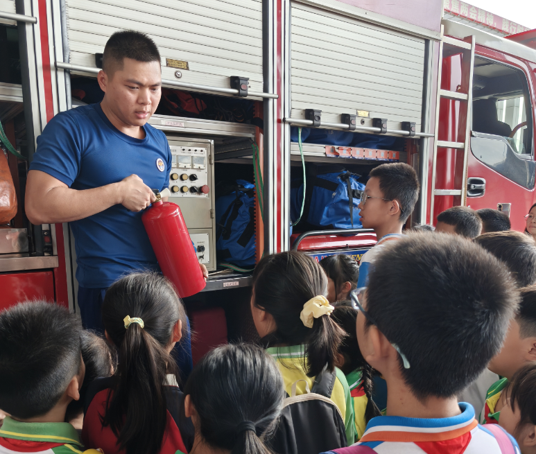 消防员向同学们介绍消防设备