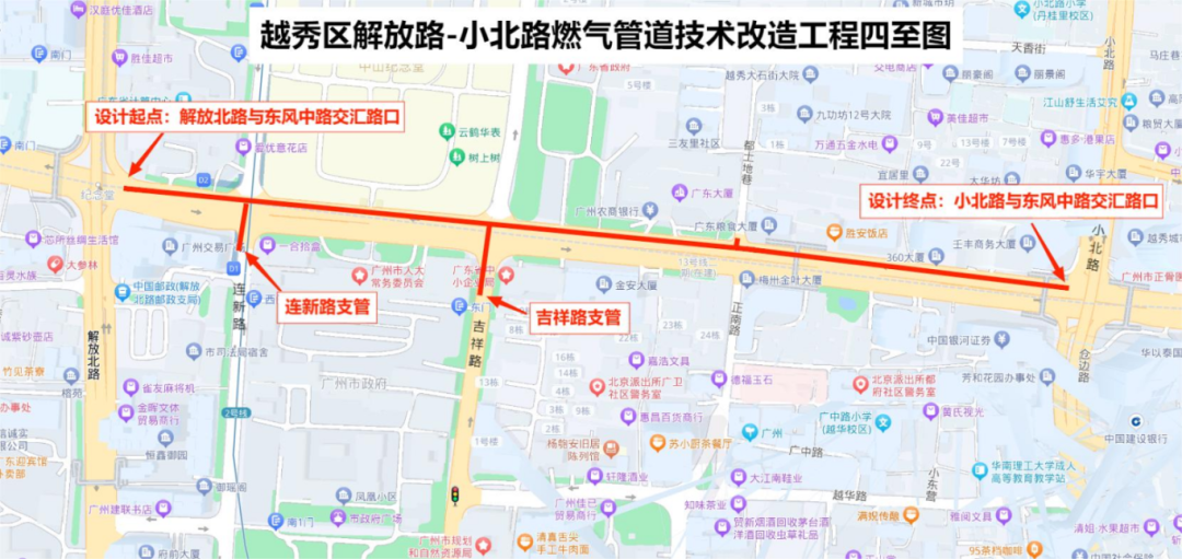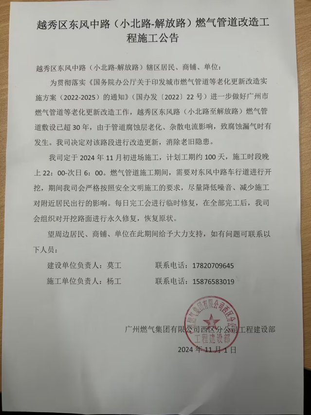 根据《国务院办公厅关于印发城市燃气管道等老化更新改造实施方案(2022—2025年)的通知》《广州市城市管理和综合执法局关于进一步做好燃气管道设施老化评估和更新改造相关工作的通知》等文件要求,广州燃气集团有限公司西区分公司将开展越秀区东风路(小北路-解放路)燃气管道改造工程,对该路段老化管网进行更新改造,消除管道腐蚀泄露隐患,切实有效维护人民群众生命财产安全和城市安全运行。升级改造,保障市民用气安全