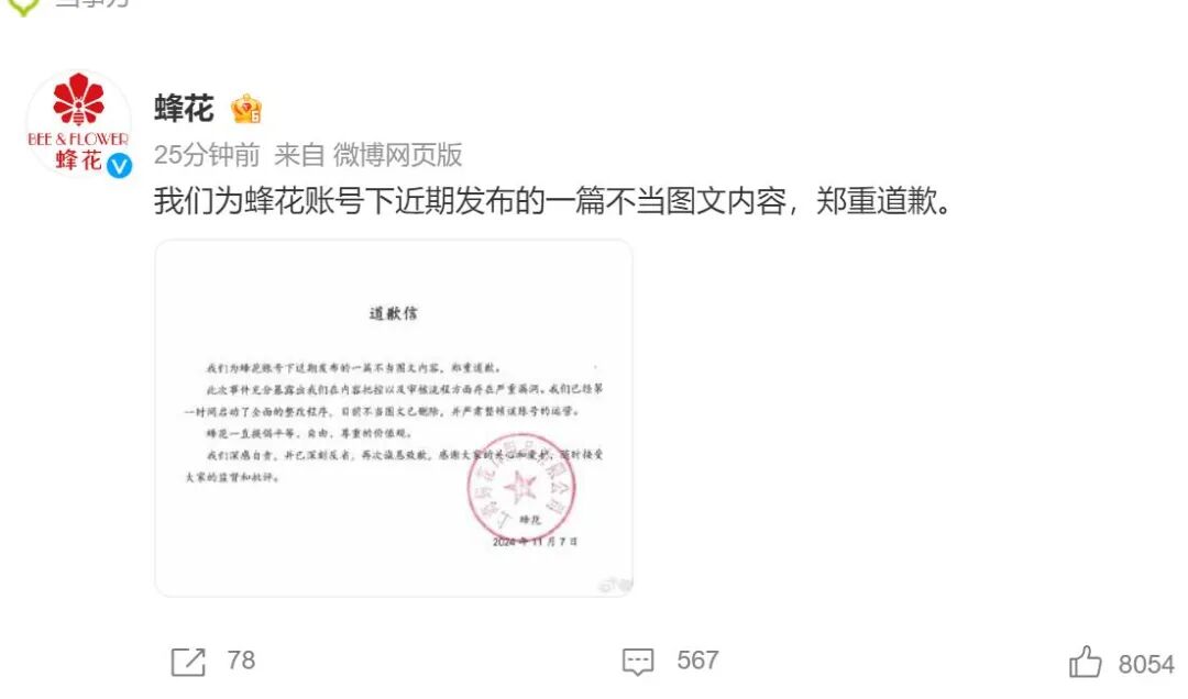 11月7日,蜂花发布道歉信称,为其账号下近期发布的一篇不当图文内容,郑重道歉。信中表示,此次事件充分暴露出蜂花在内容把控以及审核流程方面存在严重漏洞。蜂花已第一时间启动了全面的整改程序,目前不当图文已删除,并严肃整顿该账号的运营。