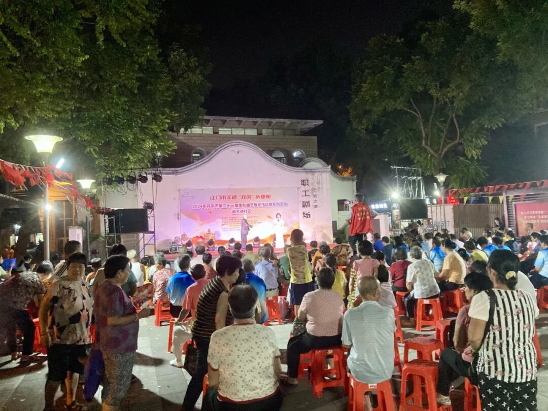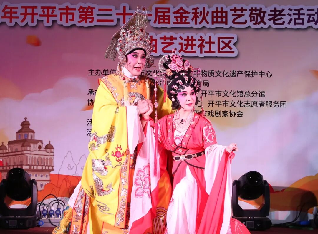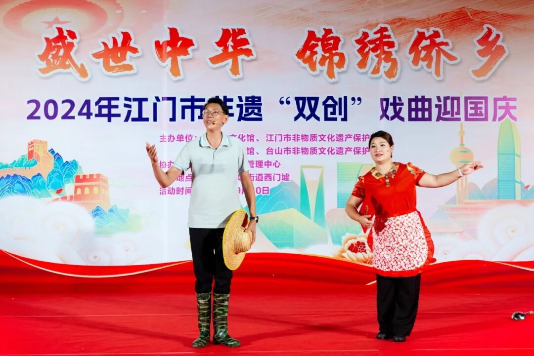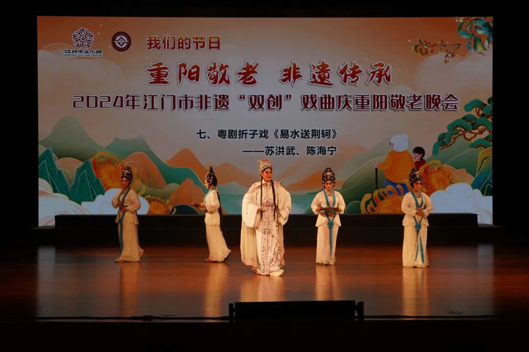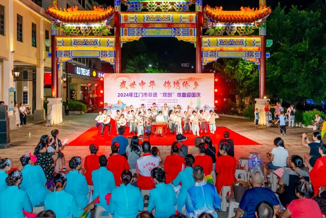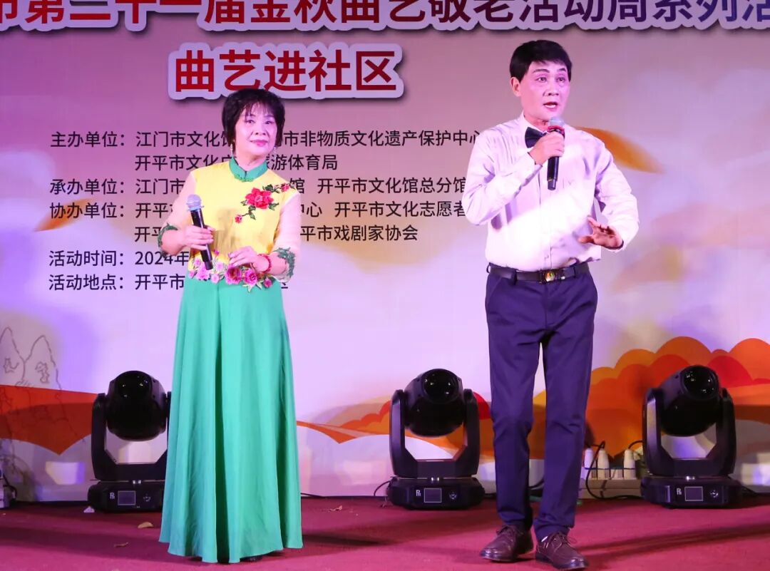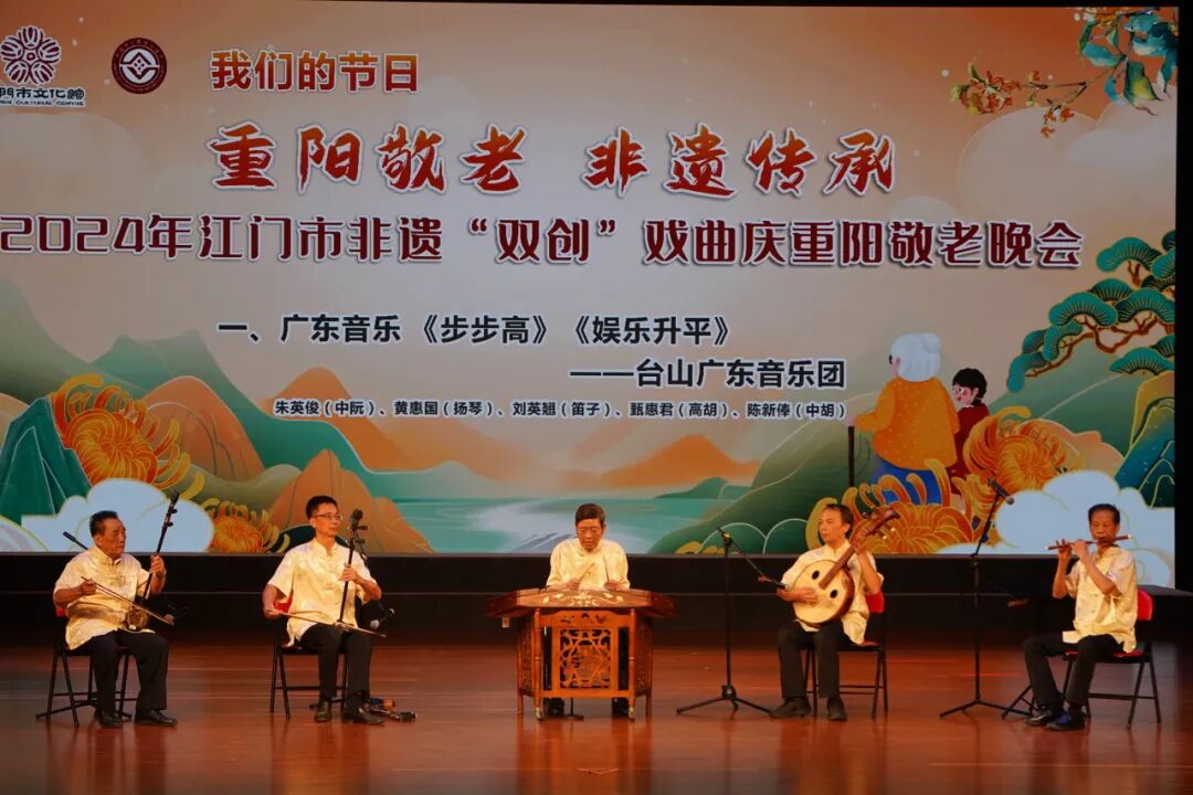10月11日晚,由江门市文化馆、江门市非物质文化遗产保护中心主办的2024年江门市非遗“双创”戏曲庆重阳敬老晚会在江门市文化馆文化剧场璀璨上演。演出呈现了广东音乐《步步高》《娱乐升平》,开平民歌表演唱《碉楼之乡欢迎您》《祈祷歌》,原创粤曲独唱《岭海风流》选段,粤曲对唱《七月七日长生殿》选段,粤曲对唱《柳毅传书之花好月圆》选段等精彩节目。