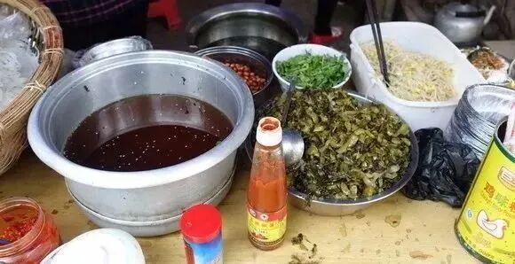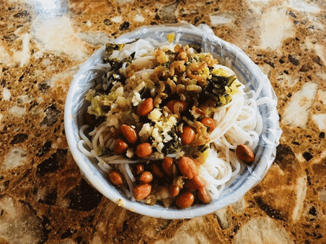 还有些米粉的配料不那么显眼。雷州半岛上的徐闻人爱吃腌粉(约等于“拌粉”),细米粉丝配上花生油、花生米、蒜泥、虾米、酱油调制的佐料,还可以根据喜好,加青菜、肉丝、酸菜,即“腌”即食,看起来没有太多食材,但各种味道早已渗透粉间。
