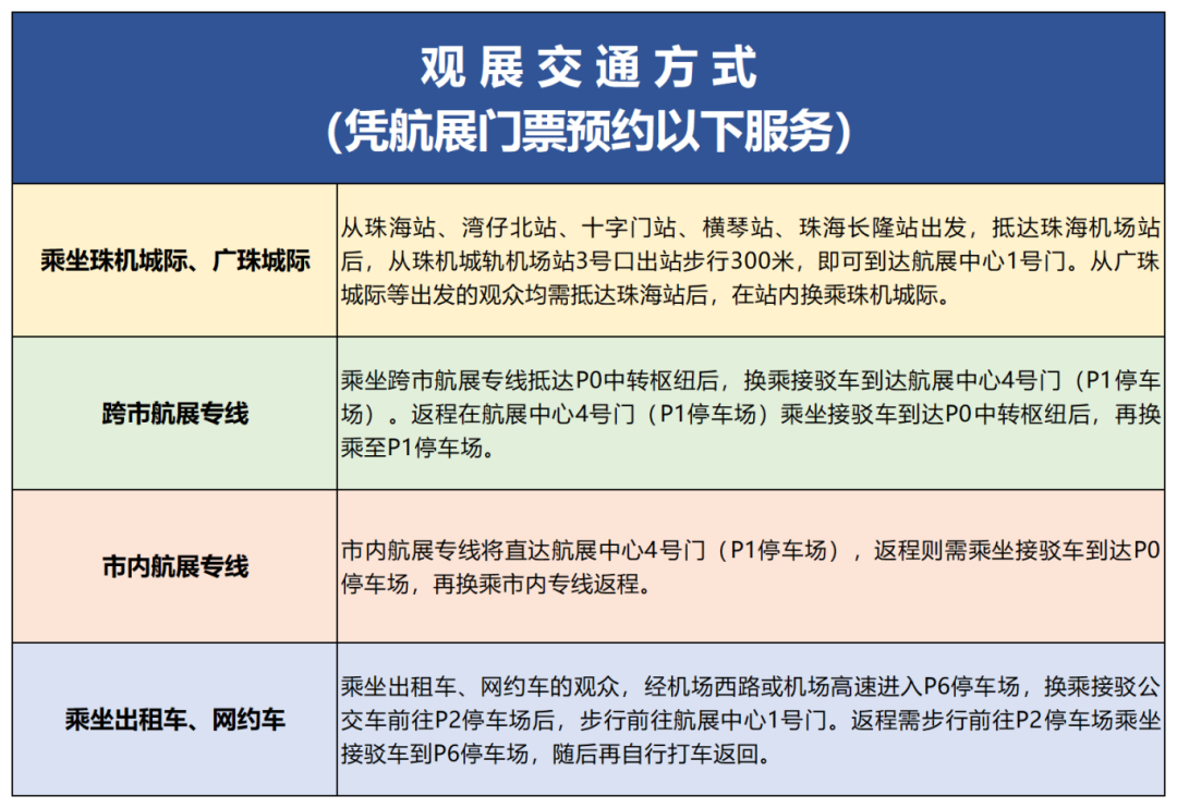 注意:需提前通过“珠海公交旅运”公众号购买市内航展专线巴士往返套票。