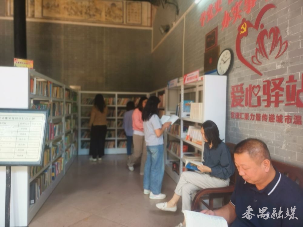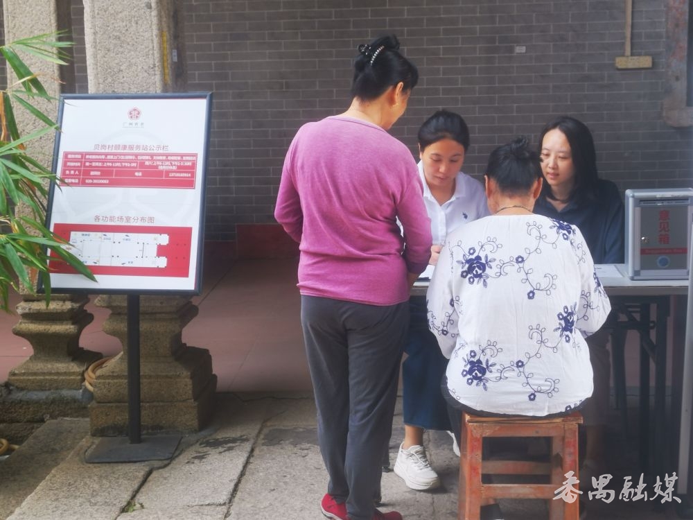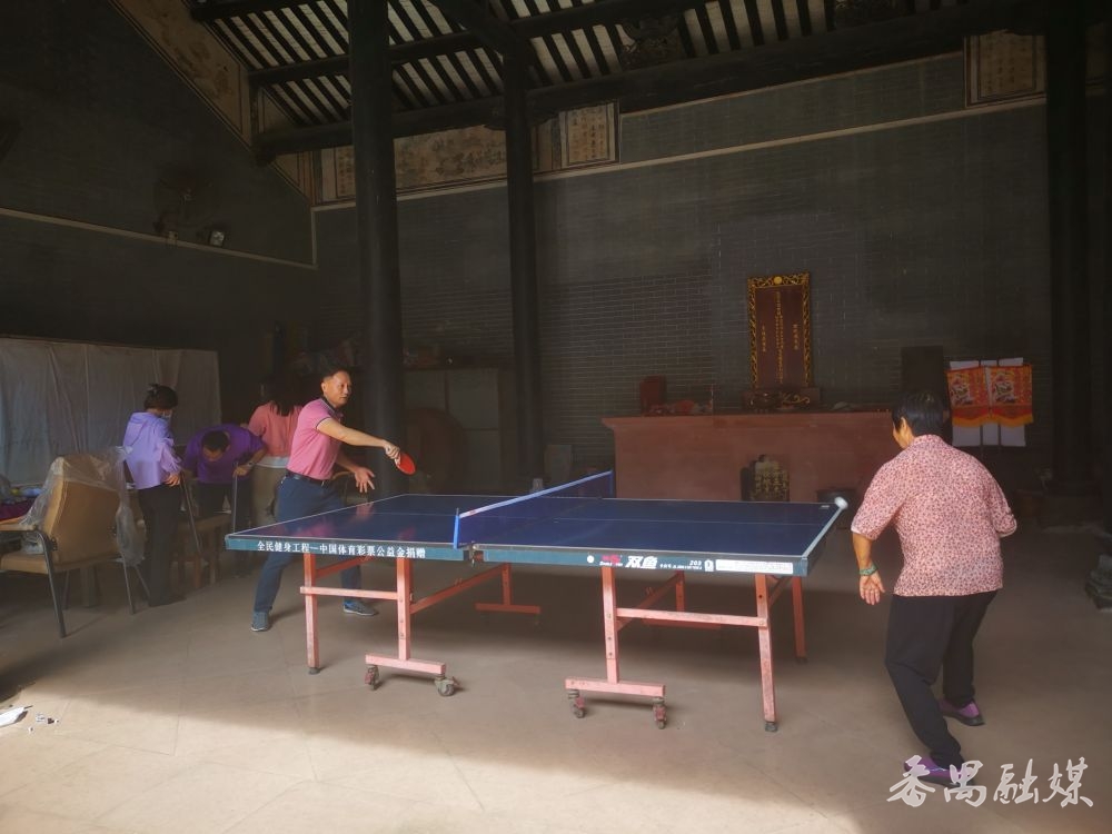 记者在采访当天,除了潘永强的紫红曲艺社的成员在唱粤曲外,还有村民在祠堂里打乒乓球、看书、聊天,以及了解颐康服务项目情况等。