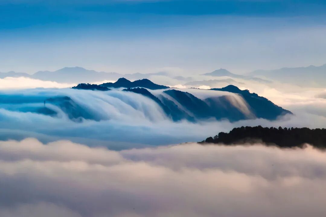 云海漫过山巅,如同潮汐在峰峦间起伏,盖上了一张轻柔的棉絮被。