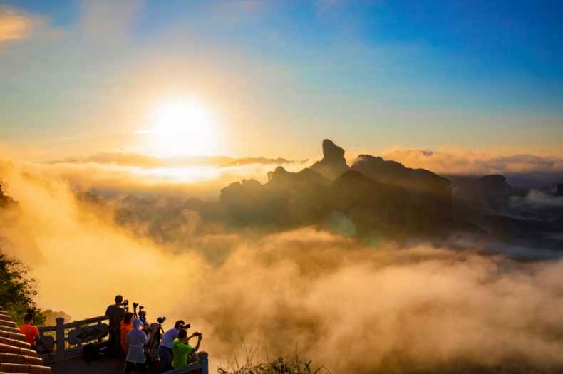 丹霞山,以其独特的红色岩石地貌而闻名于世。 每当丹霞山出现云海景观,赤壁丹崖、锦江、古村……就汇成了一幅动态的山水画,如幻如梦,苏轼造访此处时曾雅赞“此方定是神仙宅”。