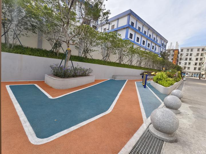 11月13日上午,记者来到旧水坑村新城路南侧盈新雅筑1号、2号楼的街巷,一个名为盈新雅境的口袋公园映入眼帘,公园位于村民住房与工厂宿舍的围墙之间,呈带状分布,公园里面有儿童篮球场、游园路径、微型花境、健身设施等,地面用橡胶铺装,有的家长带着小朋友在玩篮球,有的村民在健身。从小公园往前面走,路边设置有电动自行车车棚、充电桩和垃圾分类投放点,围墙粉饰一新,还安装了墙面灯带。“修建了小公园,环境更漂亮,我们一有时间就到这里玩。”住在附近的一位居民告诉记者,晚上灯光亮起来,小公园这里的夜景也很漂亮,游玩的人更多。