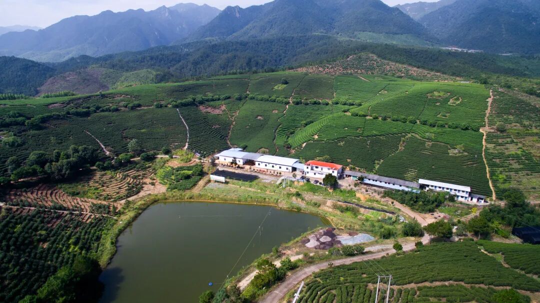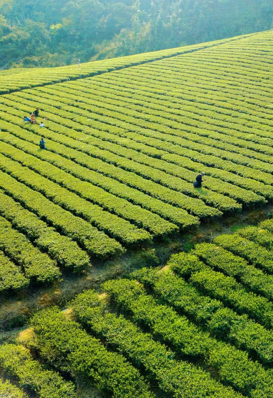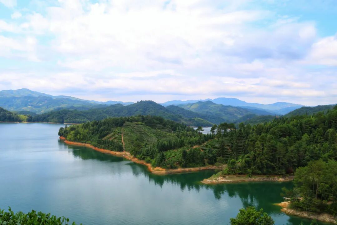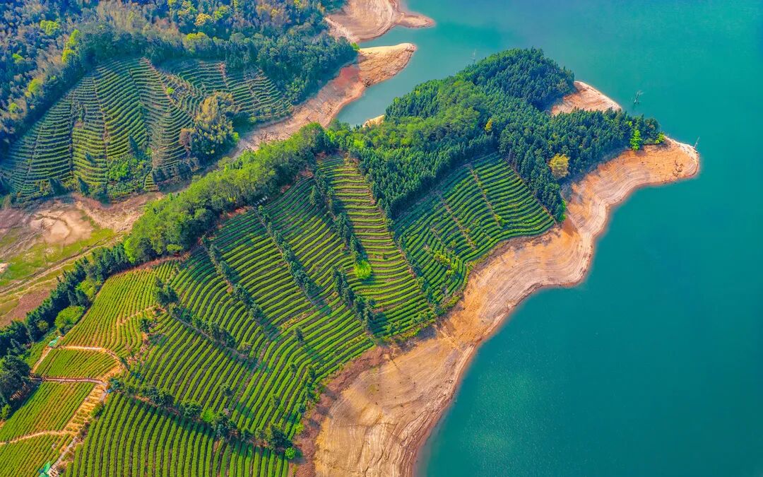 远处眺望,一垄垄茶树依着山势向水库展开,