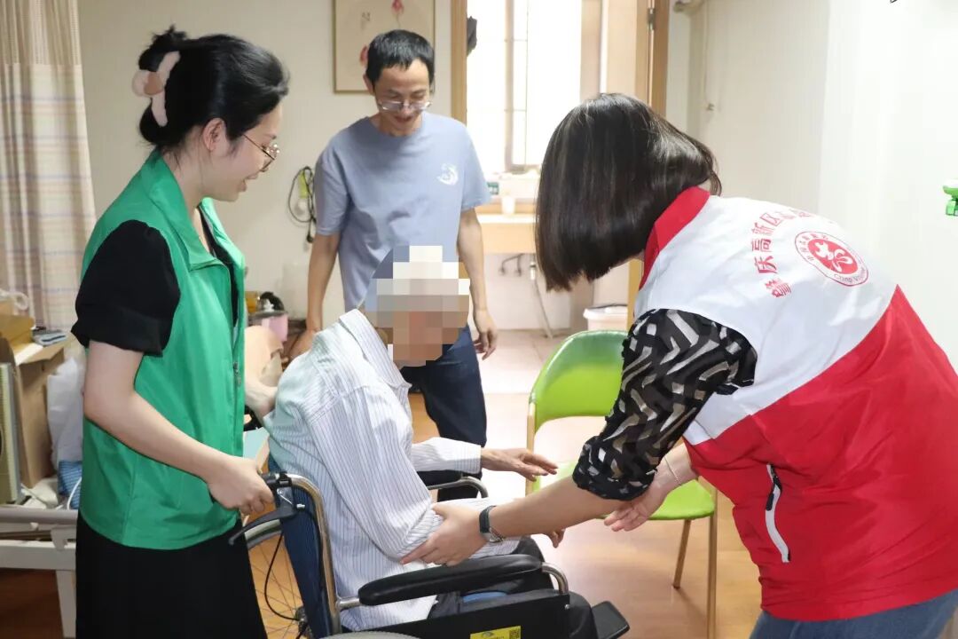 工作人员到大旺颐养院为老人送轮椅并与其交谈。