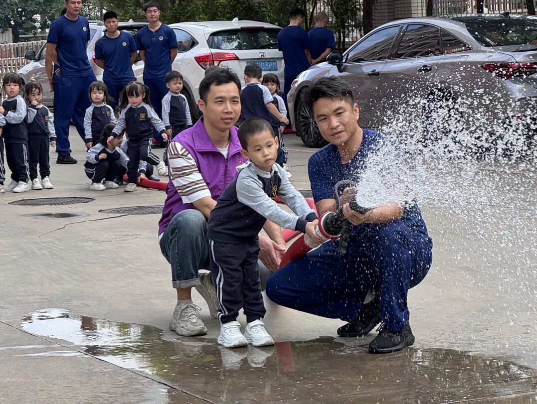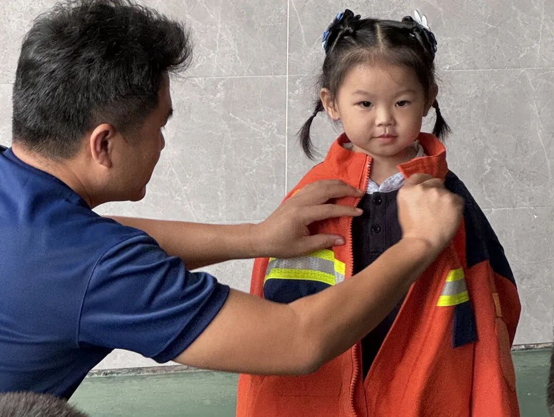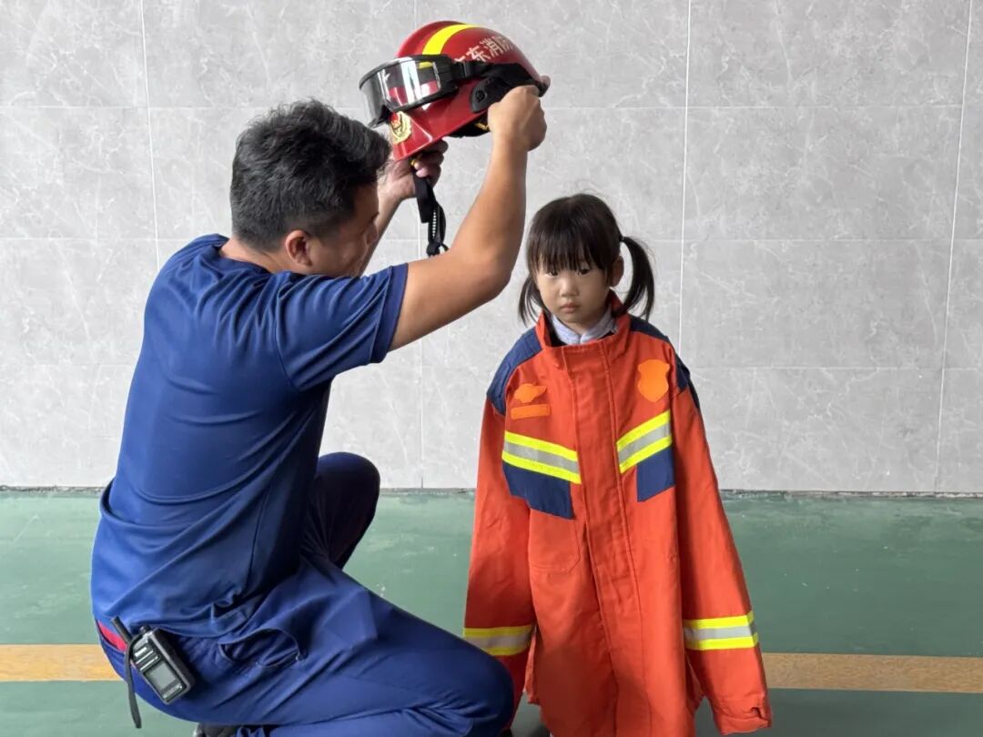 随后,在消防员的指导下,孩子们兴奋地试穿了消防服,亲身体验了一把“小小消防员”的风采,感受消防员在执行任务时的重量与责任。在消防员的指导下,小朋友们还学习了如何使用水带水枪。