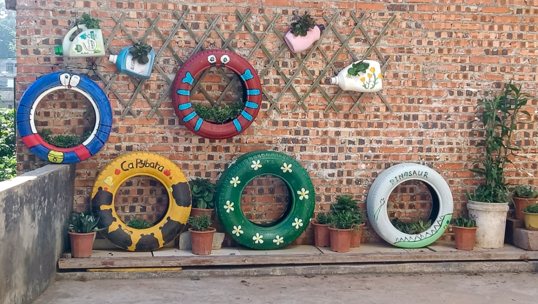 在大塘村温伯家,原本杂物乱堆的庭院,已重新归置整齐,庭院的一角摆上了绿植,种上了花草,庭院景色焕然一新,随处可见的竹子做成了花架挂上了墙,废弃的轮胎绘上了可爱的图案,既是换盆也是装饰品;用空的瓶子成了花篮,闲置的石墩成了绿植高低错落的垫脚石……巧手制作,变废为宝,这些低成本高颜值的“饰品”成为黎少镇美丽庭院建设的对象,也成为良好家风文明新风的见证。