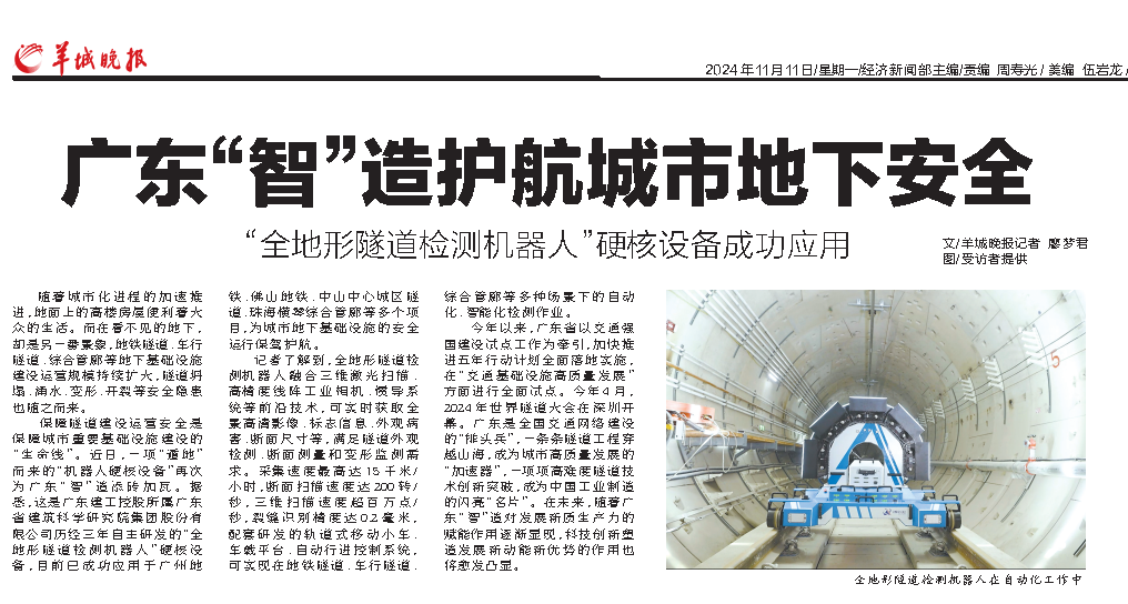 广东建工控股完整、准确、全面贯彻新发展理念和省委“1310”具体部署,积极服务和融入新发展格局,围绕加快发展新质生产力加大科技攻关,推动建筑产业转型升级。目前,广东建工控股所属广东建科院自主研发的“全地形隧道检测机器人”硬核设备已成功实现多场景应用,为城市地下基础设施的安全运行保驾护航,该科技成果受到媒体广泛关注。
