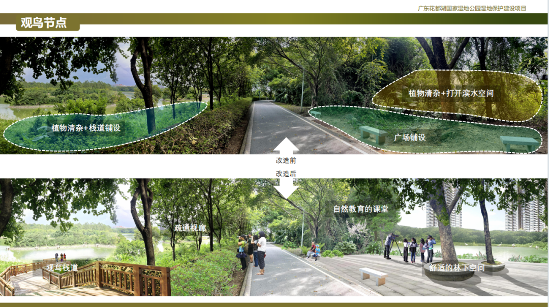 在花都湖康体路附近,通过林木清杂、林下植被营造、疏林草地和花卉植物组团搭配、有色植物种植等打造多彩湿地。同时设计观鸟栈道和自然教育课堂广场,加强湿地科普教育体系建设。在下游鹭鸟岛在栈道处,建设了一间木质观鸟屋,还配置观测设备,便于市民游客观赏湿地水鸟。通过生态修复和科普设施建设,保护和恢复湿地景观,丰富生物多样性,提高人们对湿地的认识和湿地保护意识,实现人与自然的和谐发展。