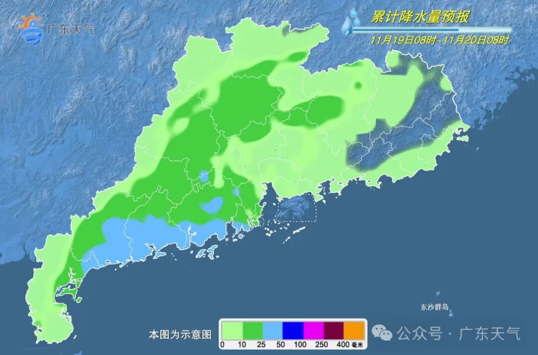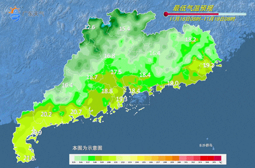 19日白天,珠江三角洲、阳江、河源、梅州、粤东市县多云转小雨局部中雨,其余市县多云,局部有小雨。最低气温:清远北部、肇庆、韶关、河源、梅州北部市县13~16℃,南部沿海市县19~21℃,其余市县16~19℃。