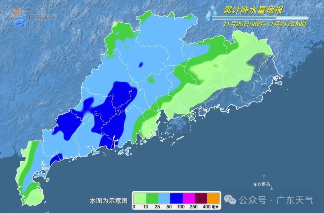 19日夜间到21日早晨,粤西、珠江三角洲西部、韶关南部、清远南部市县有大雨部分市县暴雨,粤东市县多云,有分散小雨,其余市县有小到中雨。受降水影响,气温进一步下降,20日早晨最低气温:粤北和珠江三角洲北部市县12~15℃,南部沿海市县17~20℃,其余市县15~17℃。