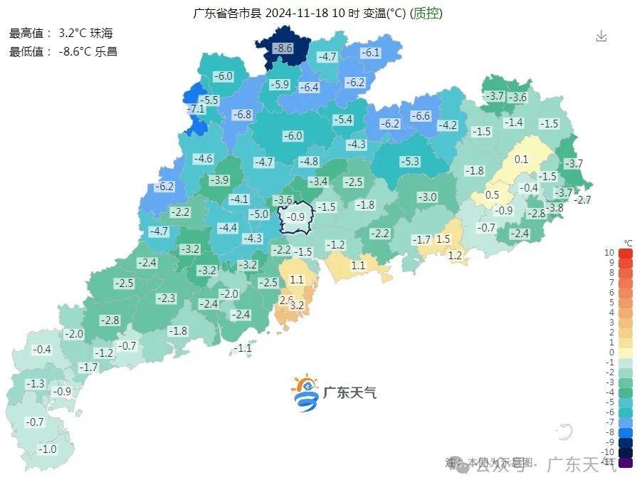 “万众期待”的冷空气今天(18日)如约而至,受其影响,上午10时,我省气温同比昨天普降2-6℃,最剧烈的乐昌降了有8.6℃,我们终于迎来了久违的秋凉感。