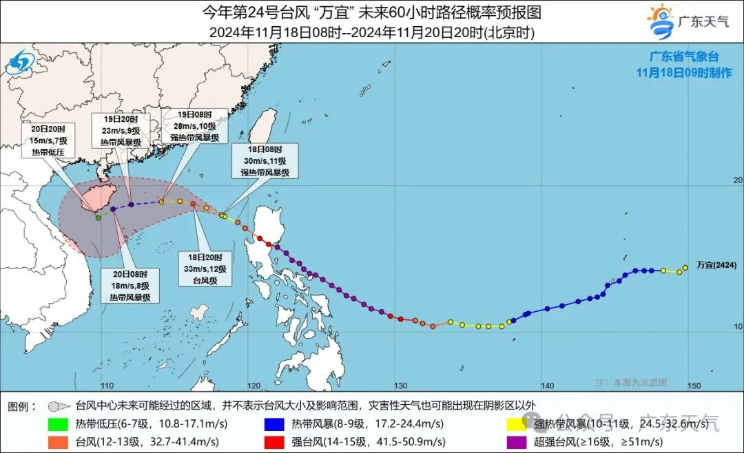 今年第24号台风“万宜”已于昨天(17日)下午3点前后在菲律宾吕宋岛东部沿海登陆(超强台风级),在吕宋岛高山削弱下,“万宜”快速减弱,17日夜间进入南海时,已经是普通台风级别,今天(18日)凌晨掉到了强热带风暴级。