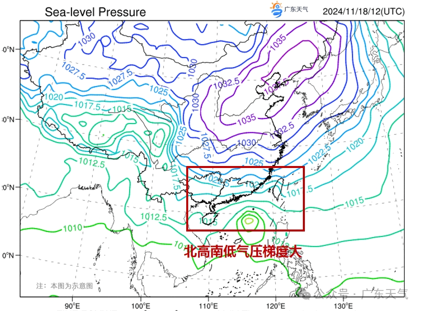冷空气与“万宜”合作,广东处于“北高南低”的形势中,气压梯度较大,海上大风停不下来,陆地有5~7级阵风。