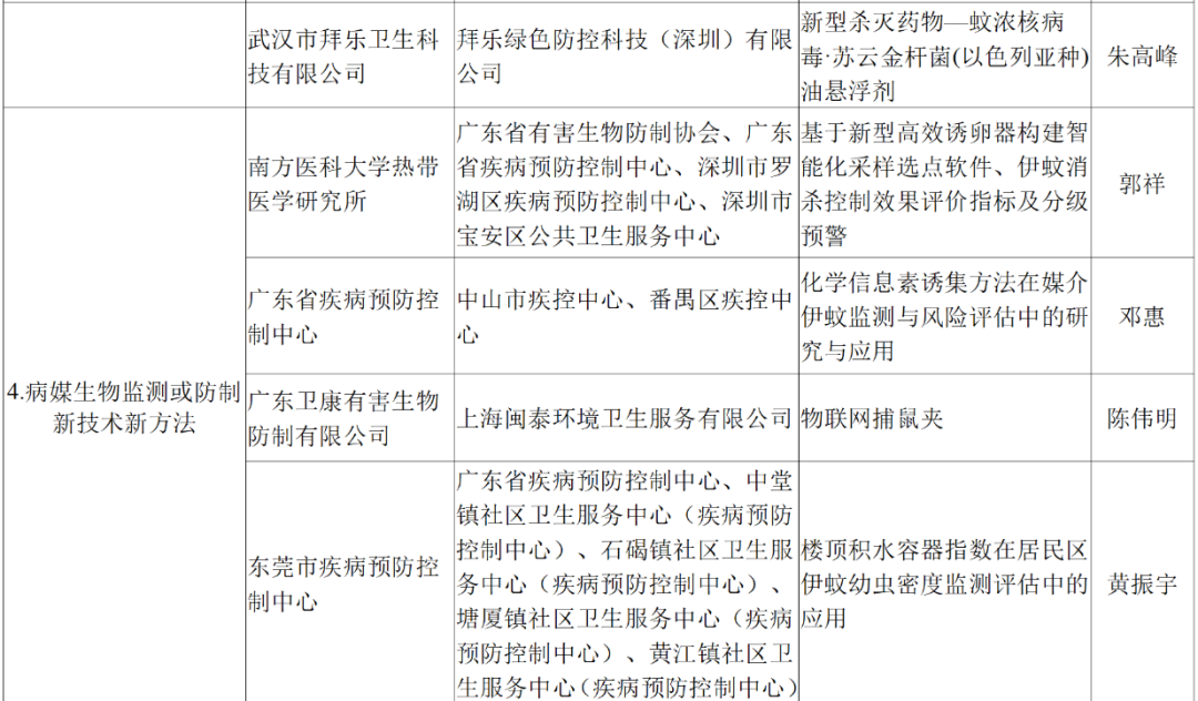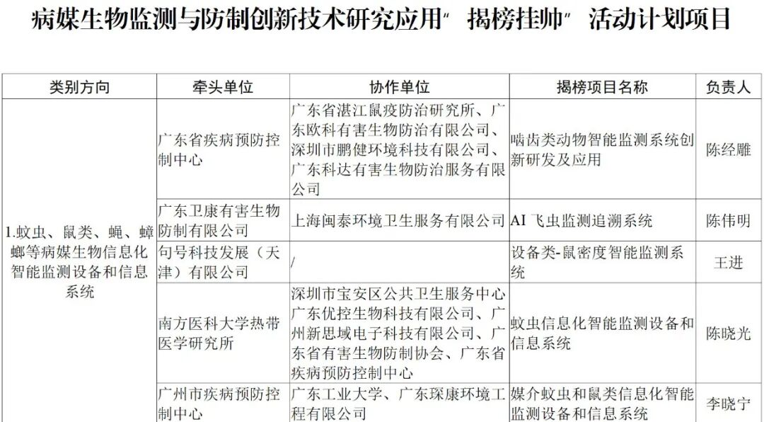 为推动病媒生物监测与防制技术创新发展,提高病媒生物防制效率和质量,今年7月,广东省爱卫办印发《关于组织开展病媒生物监测与防制创新技术研究应用“揭榜挂帅”活动的通知》,公开征集病媒生物监测与防制创新技术研究应用项目。