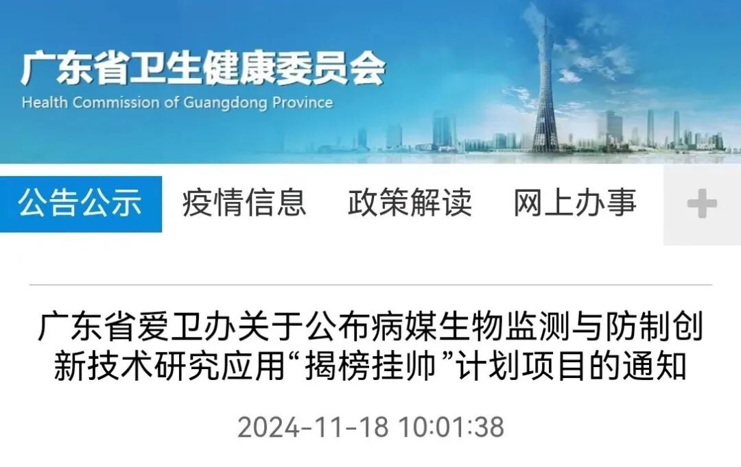 今天(11月18日),广东省爱卫办发布《关于公布病媒生物监测与防制创新技术研究应用“揭榜挂帅”活动的通知》(以下简称《通知》)。